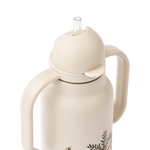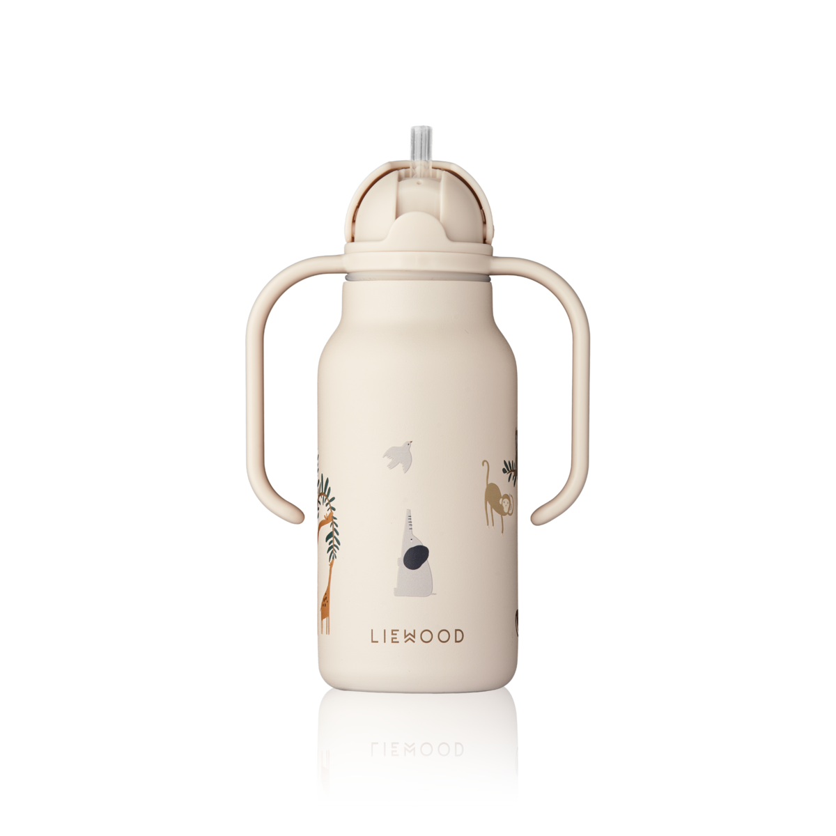 Cette gourde innovante et adaptée aux tout-petits, la bouteille KIMMIE, possède deux poignées faciles à manipuler sur le couvercle ainsi qu'une paille intégrée, et est fabriquée en acier inoxydable.