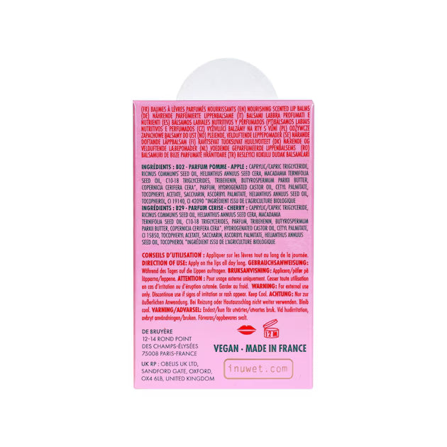 • Ingrédients Baume à Lèvres Pomme : Caprylic/Capric Triglyceride, Ricinus Communis Seed Oil, Helianthus Annuus Seed Cera, Macadamia Ternifolia Seed Oil, C10-18 Triglycerides, Tribehenin, Butyrospermum Parkii Butter, OrganicCopernicia Cerifera Cera, Parfum, Hydrogenated Castor Oil, Cetyl Palmitate, Tocopheryl Acetate, Saccharin, Ascorbyl Palmitate, Helianthus Annuus Seed Oil, Tocopherol, CI 19140, CI 42090