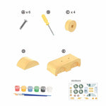 Les pièces en bois  se transforment en un jouet roulant au fur et à mesure que les petites mains assemblent, peignent et décorent leur création.
