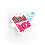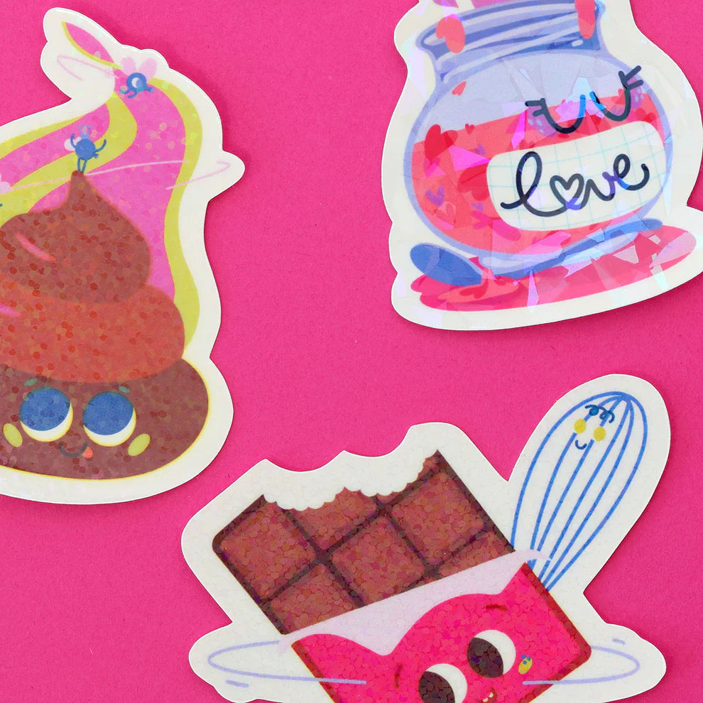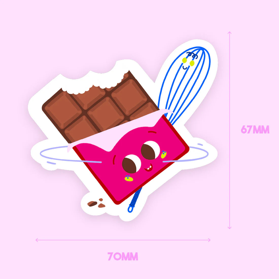 Préparez un peu de douceur avec cet adorable autocollant de barre de chocolat à paillettes! Un joyeux fouet bleu avec son propre petit visage interagit de manière ludique avec le chocolat, suggérant que de délicieuses friandises sont en route. Le ravissant laminage à paillettes holographiques ajoute un miroitement subtil mais captivant, avec de minuscules points holographiques captant la lumière pour un effet scintillant unique.