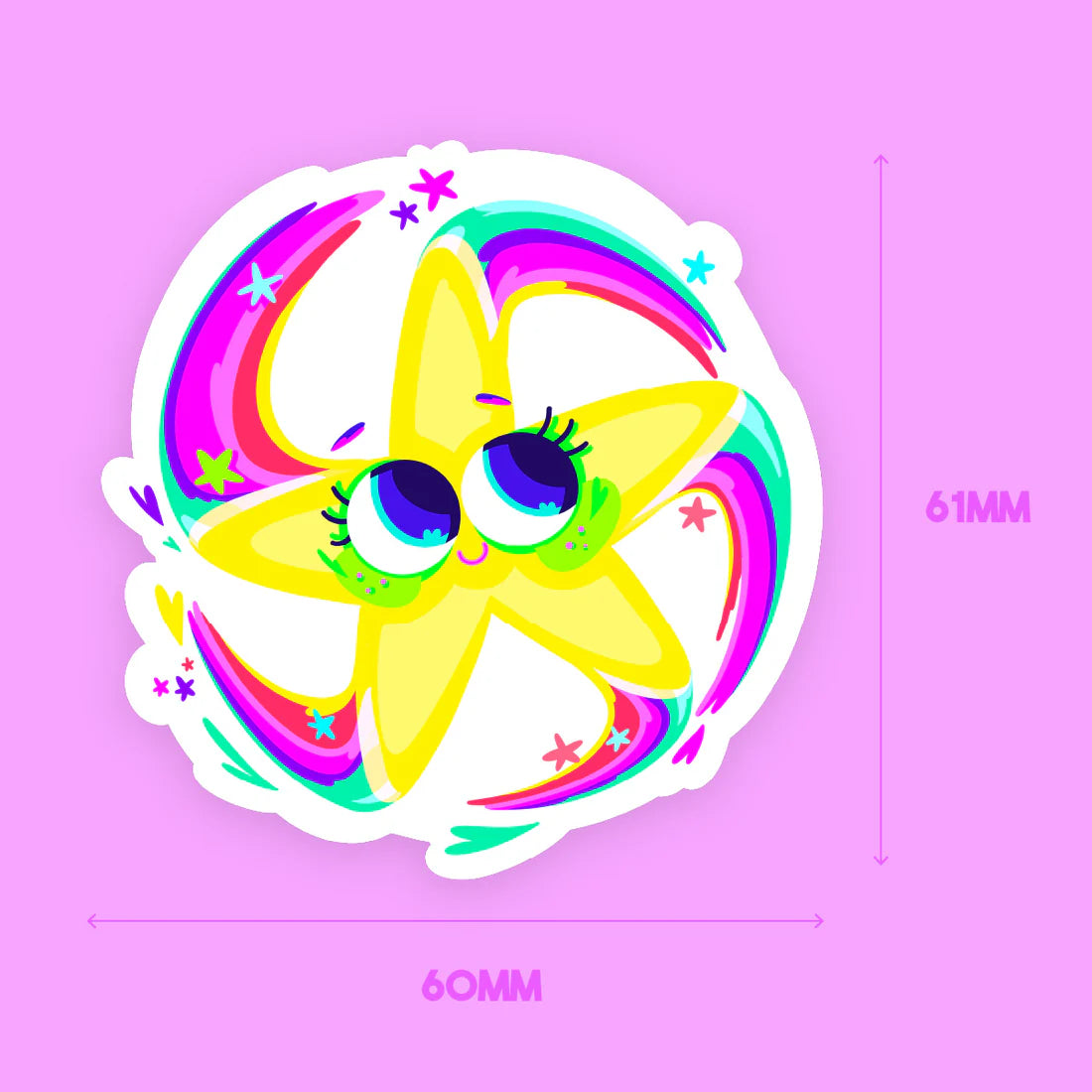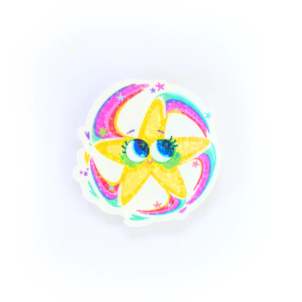Scintille, scintille, petite étoile... ! Ce charmant autocollant aux paillettes holographiques présente un mignon personnage d'étoile filante avec de grands yeux fascinants et un doux sourire. Tourbillonnant autour de l’étoile jaune vif se trouvent des traînées vibrantes de couleurs arc-en-ciel – rose, violet, turquoise et jaune – ajoutant une explosion d’énergie cosmique. Le ravissant laminage holographique à motif pointillé ajoute un miroitement subtil mais captivant, avec de minuscules points holographiques captant la lumière pour un effet scintillant unique.