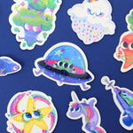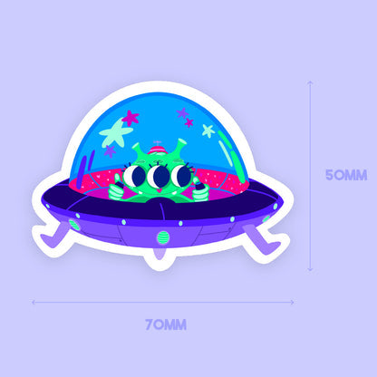 Faites briller un peu d'éclat avec cet autocollant d'extraterrestre en soucoupe volante ! Cet autocollant hors du commun représente un sympathique extraterrestre vert avec trois grands yeux, conduisant avec enthousiasme sa soucoupe volante violette. La stratification holographique étoilée fait briller cet autocollant, avec de minuscules étoiles captant et réfléchissant la lumière pour un effet magique interstellaire.