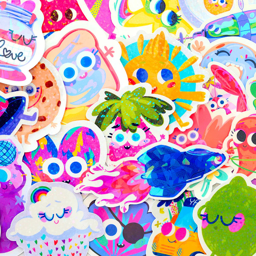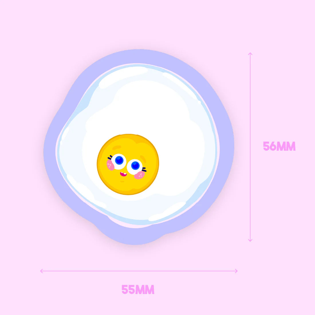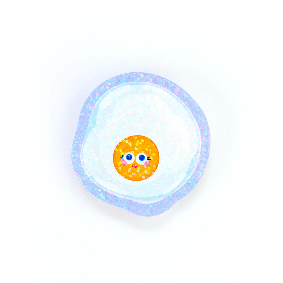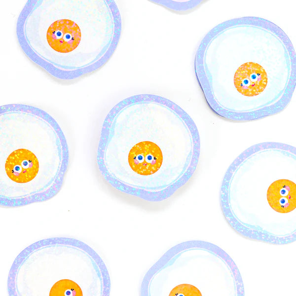 Levez-vous et brillez avec cet autocollant holographique œuf au plat à paillettes ! Cet autocollant joyeux présente un joli œuf au plat de dessin animé avec de grands yeux bleu vif, des joues roses et un doux petit sourire. Le jaune vif et le blanc apporteront à coup sûr une touche d'éclat à votre vie. Le ravissant laminage holographique à paillettes ajoute un miroitement subtil mais captivant, avec de minuscules points holographiques captant la lumière pour un effet scintillant unique.
