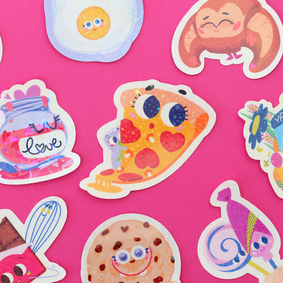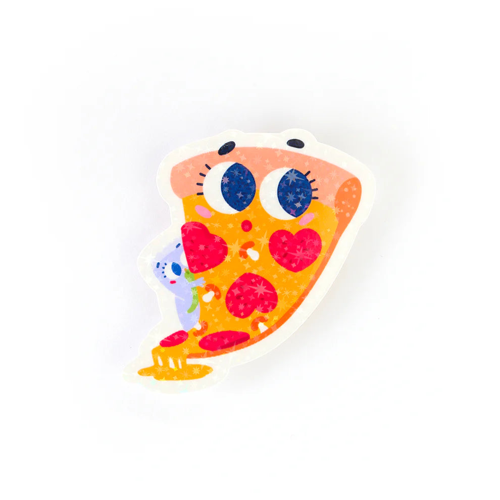 Dites fromage et brillez de mille feux avec cet adorable autocollant de pizza à motif holographique étoilé ! Cet autocollant amusant et original présente une jolie tranche de pizza avec de grands yeux expressifs, du pepperoni en forme de cœur et du fromage fondu gluant. Un paquet d'huile pimentée se cache derrière la pizza, ajoutant une touche de douceur supplémentaire. La stratification rend cet autocollant vraiment spécial, avec de minuscules étoiles captant et réfléchissant la lumière pour un effet magique et chatoyant.