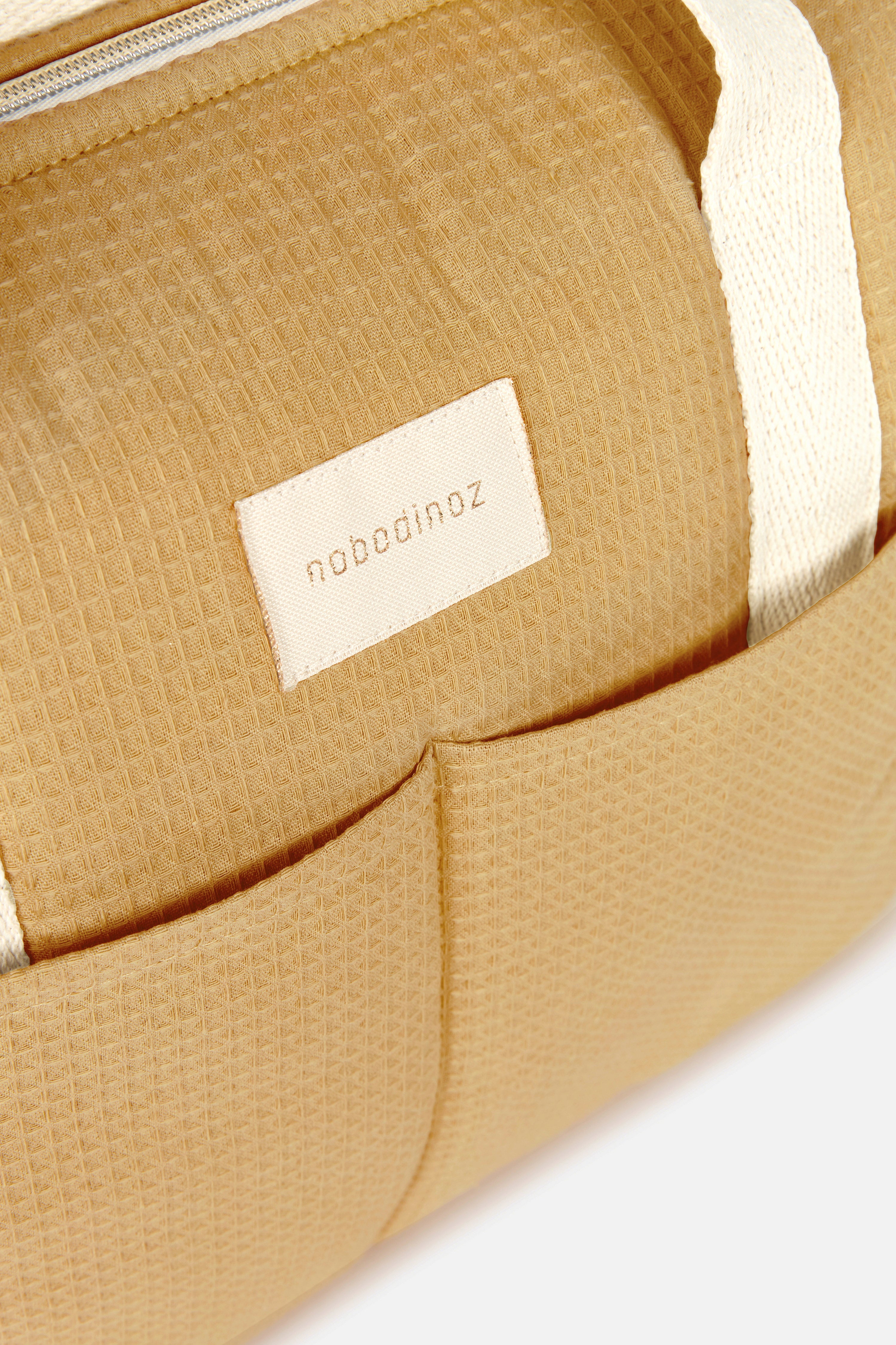 Grâce à son système de double anses en tresse de coton, vous pouvez le porter à la main, à l'épaule ou encore l'accrocher à la poussette pour plus de liberté.