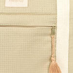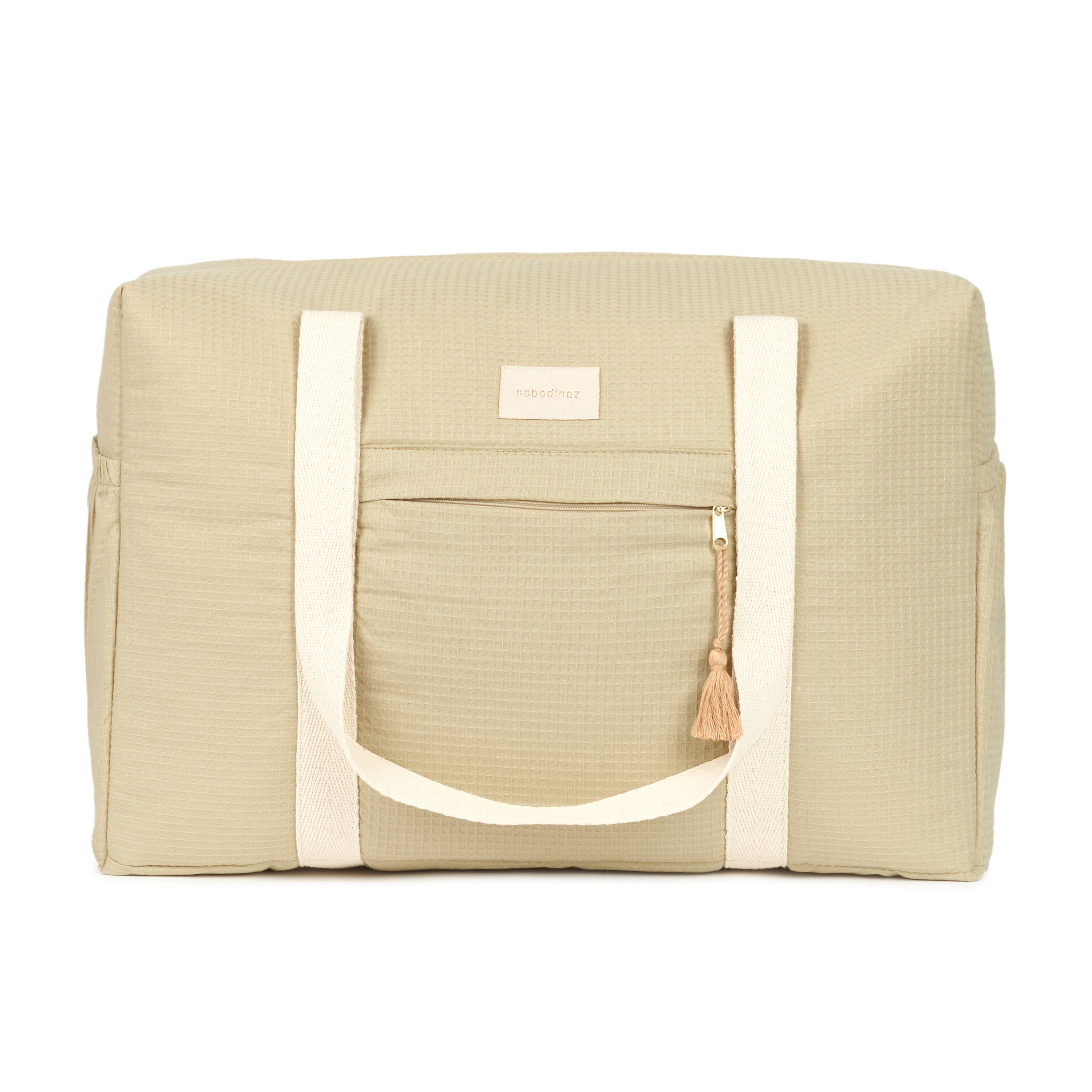 Accompagnez-le d'une trousse de toilette et d'un tapis à langer imperméable. Ils sont tous en nid d’abeille 100% coton bio, raffiné, élégant et résistant, idéal pour les affaires de maternité. Le dessin du nid d’abeille est exclusif, conçu en collaboration avec nos tisseurs barcelonais.